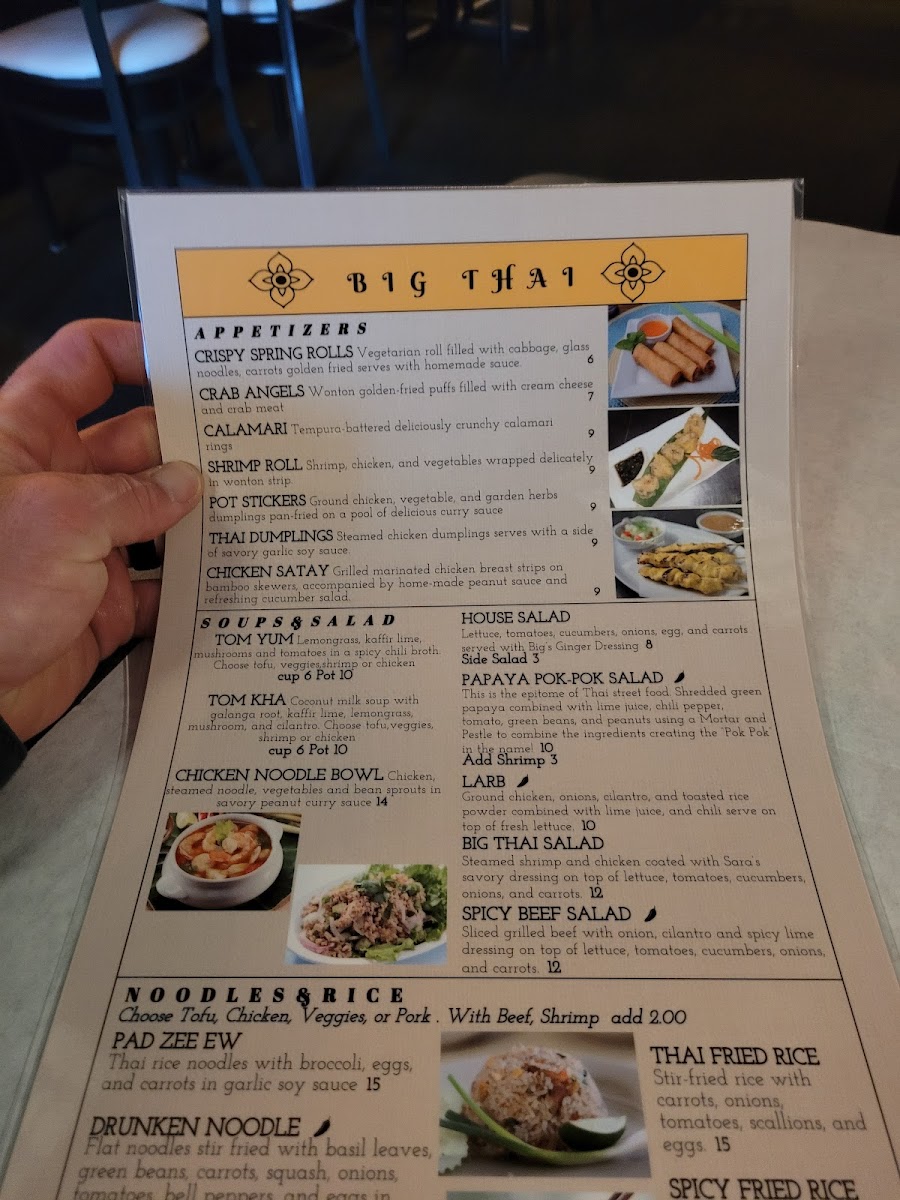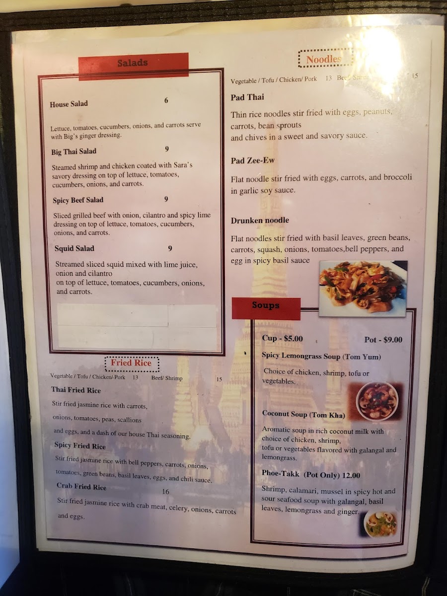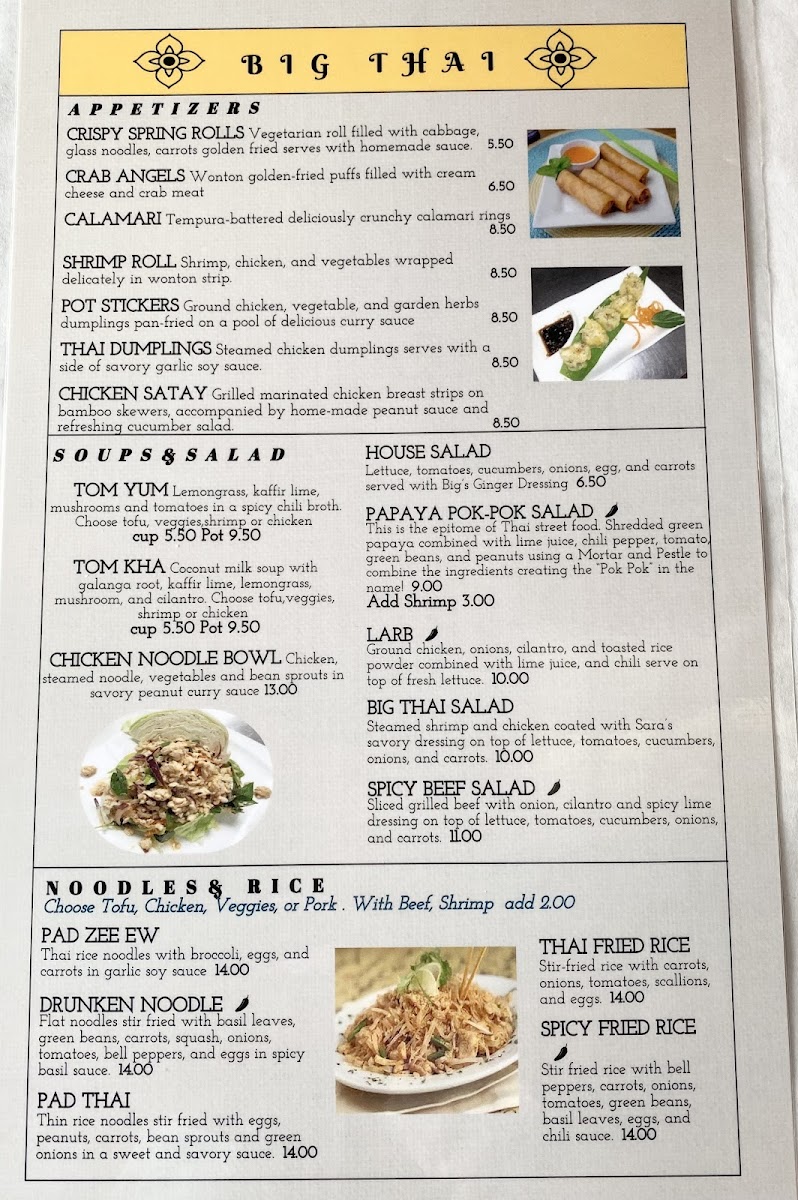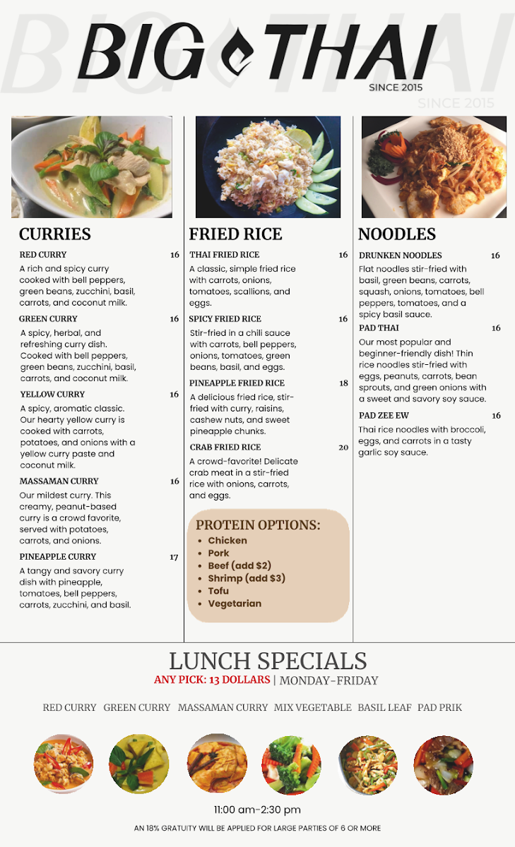 If you're craving a vibrant mix of authentic flavors, the Big Thai Restaurant Menu offers a delightful experience. Located at 117 N Parking Pl in Lake Jackson, Texas, this spot serves up a variety of classic Thai dishes that will satisfy any palate. From spicy curries to savory stir-fries, there’s something for everyone, whether you're a fan of bold heat or prefer something a bit milder. The menu features a selection of traditional appetizers like crispy spring rolls and satay skewers, alongside hearty entrees such as Pad Thai, drunken noodles, and Thai basil chicken. If you’re in the mood for something different, you can’t go wrong with their seafood specials or refreshing salads that bring in a perfect balance of crunch and zest. Each dish is crafted with fresh ingredients, bringing out the true essence of Thai cuisine. Whether you're stopping by for lunch or a relaxing dinner, the Big Thai Restaurant Menu guarantees a satisfying and flavorful experience.