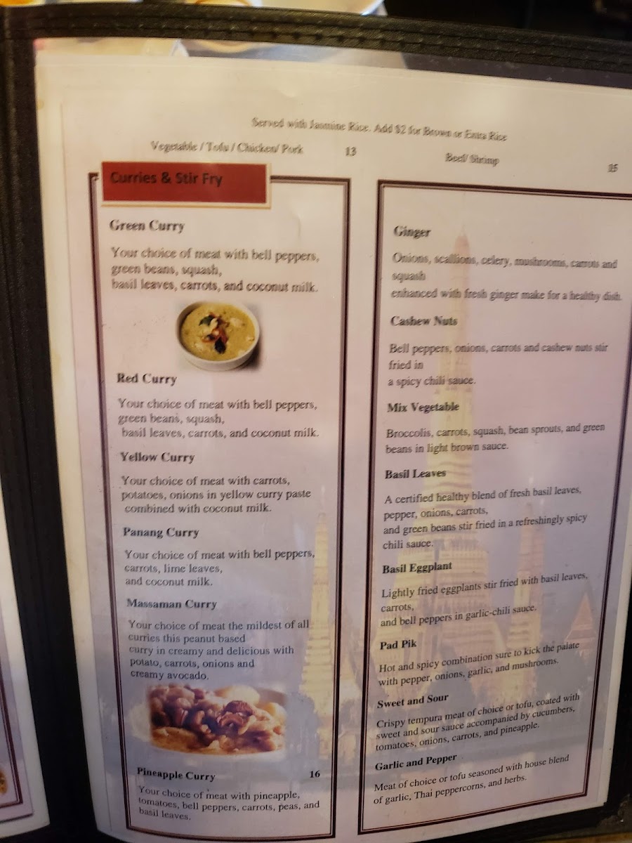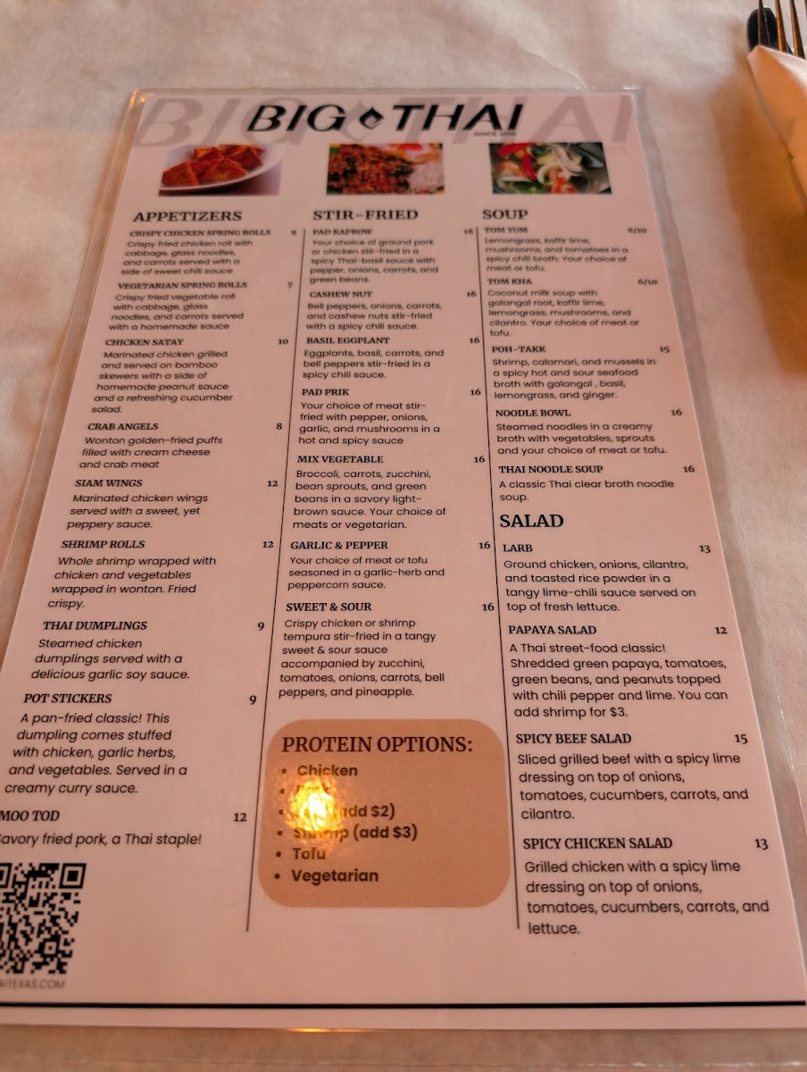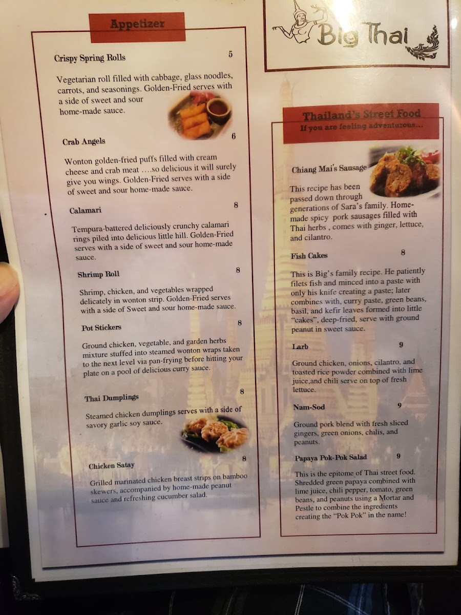 If you're craving a vibrant mix of authentic flavors, the Big Thai Restaurant Menu offers a delightful experience. Located at 117 N Parking Pl in Lake Jackson, Texas, this spot serves up a variety of classic Thai dishes that will satisfy any palate. From spicy curries to savory stir-fries, there’s something for everyone, whether you're a fan of bold heat or prefer something a bit milder. The menu features a selection of traditional appetizers like crispy spring rolls and satay skewers, alongside hearty entrees such as Pad Thai, drunken noodles, and Thai basil chicken. If you’re in the mood for something different, you can’t go wrong with their seafood specials or refreshing salads that bring in a perfect balance of crunch and zest. Each dish is crafted with fresh ingredients, bringing out the true essence of Thai cuisine. Whether you're stopping by for lunch or a relaxing dinner, the Big Thai Restaurant Menu guarantees a satisfying and flavorful experience.